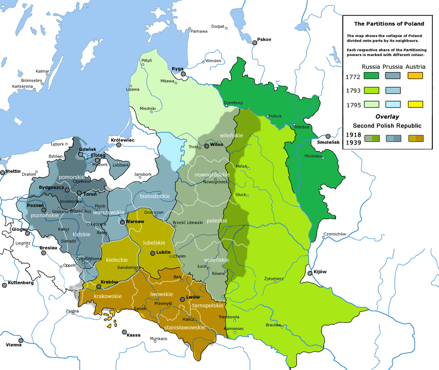 - By User:Poeticbent: two maps overlaid to delineate recovered territories of the Commonwealth following World War I. Rzeczpospolita_Rozbiory_3.png: Halibutt Derivative work: Sneecs (talk) File:Poland administrative division 1922 literki.png – File:Partitions of Poland.png File:Rzeczpospolita_Rozbiory_3.png, CC BY-SA 3.0, https://commons.wikimedia.org/w/index.php?curid=56666858