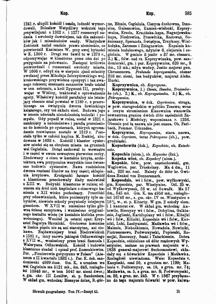 William F. “Fred” Hoffman, publications editor, was translating Slownik entries for the Polish Genealogical Society of America. I asked him to add Koprzywnica and Gnieszowice to the list. These translations, by Mark Kaszniak and edited by William F. Hoffman, have been posted to the Polish Roots website and are listed here with their kind permission.