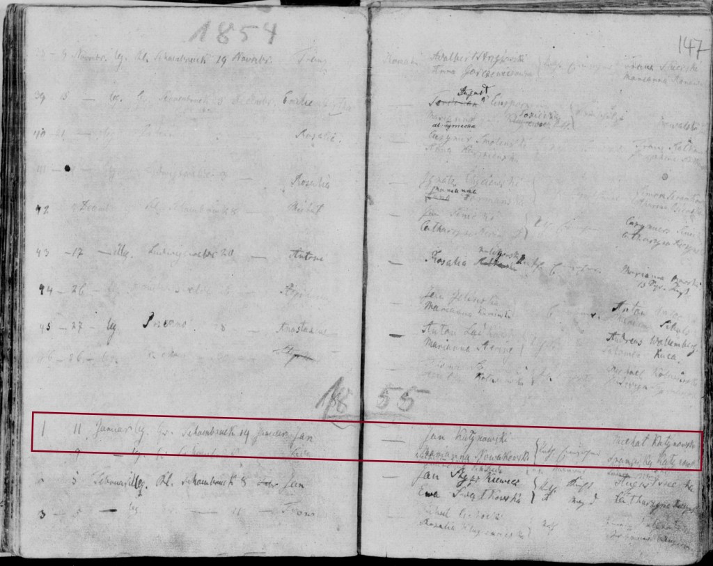 • LDS Family History Library, “Szembruk (Grudziądz),” database, Kościół rzymsko-katolicki. Parafja, Family Search (familysearch.com: accessed 18 July 2020), Jan Kałynowski; citing Germany, Preußen, Westpreußen, Groß Schönbrück – Church records; https://www.familysearch.org/ark:/61903/3:1:3Q9M-CS8M-3CGR?i=152&cat=295340