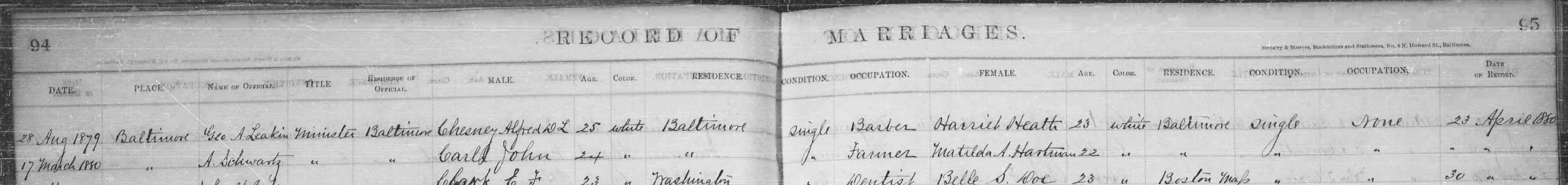 Baltimore, Maryland Marriage Record, 17 March 1880, minister A. Schwartz, John Carll and Matilda Hartmann