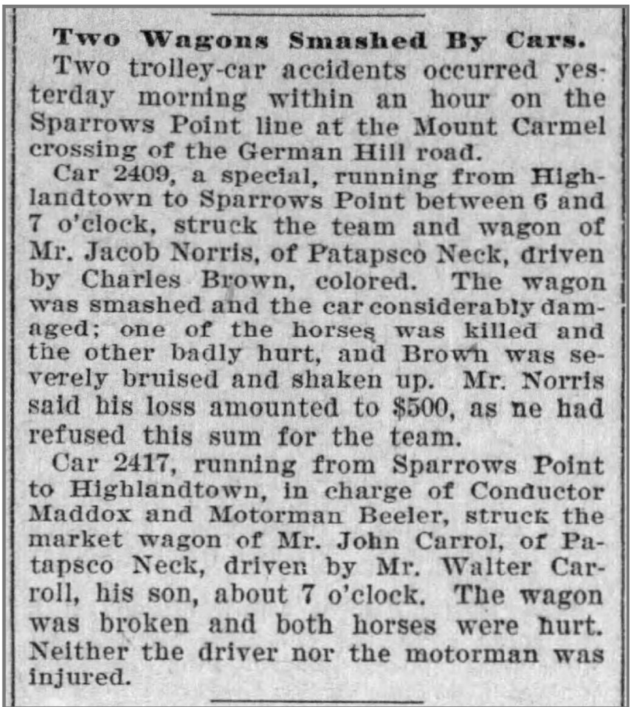 • “Two Wagons Smashed by Cars,” The Baltimore Sun (Baltimore, Maryland), 12 Jan 1904, Page 7.