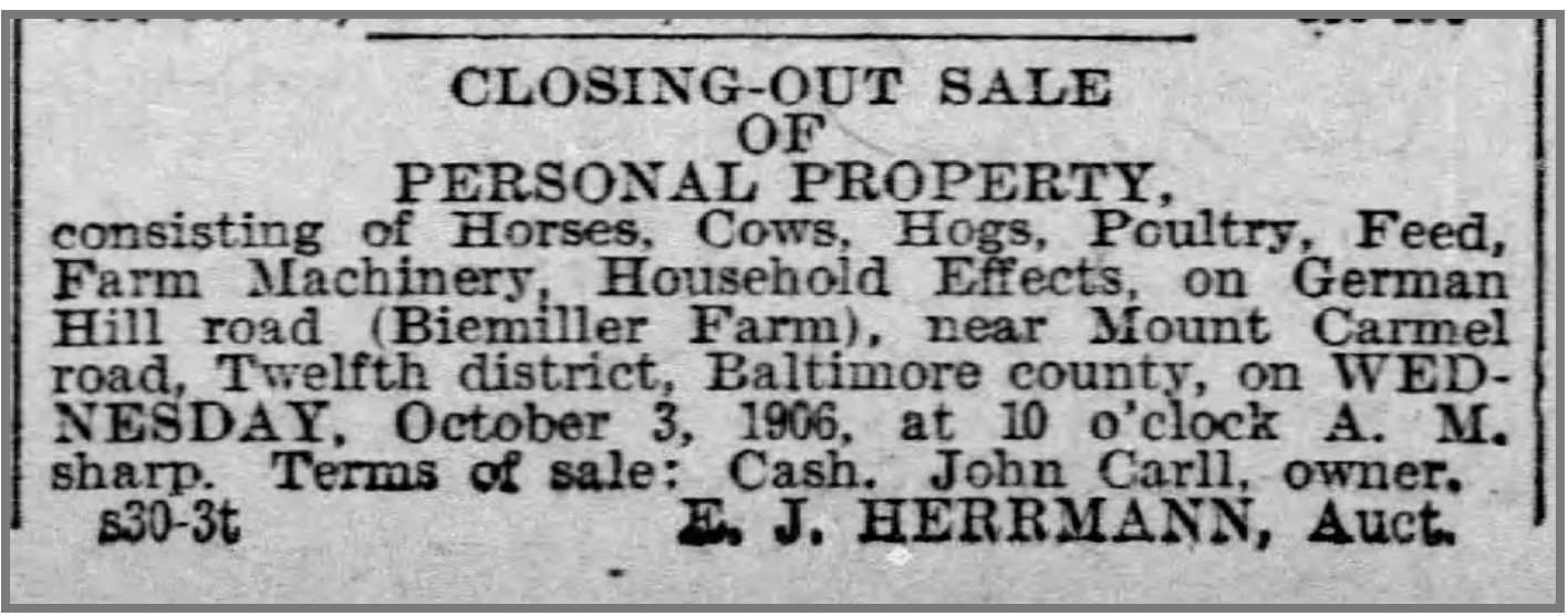 In October 1906, John Carll sold his personal property–livestock, machinery, and household effects–from the Biemiller Farm on German Hill road near Mount Carmel road in Baltimore County.
