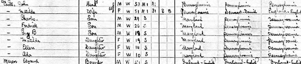Most of the Carll family moved to California. In 1910, they lived at 220 Stockton Road in Sutter, Sacramento, California. John and Matilda‘s children Charles, Frederick, Guy B., Matilda, Ellen, and Ada were with them. Walter had married in Baltimore in 1907. John was not with the family and likely had already married.