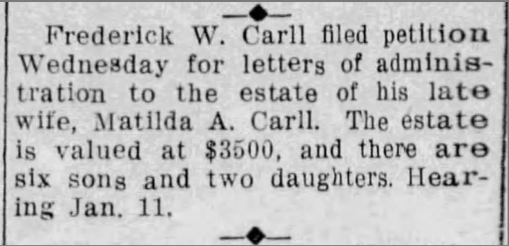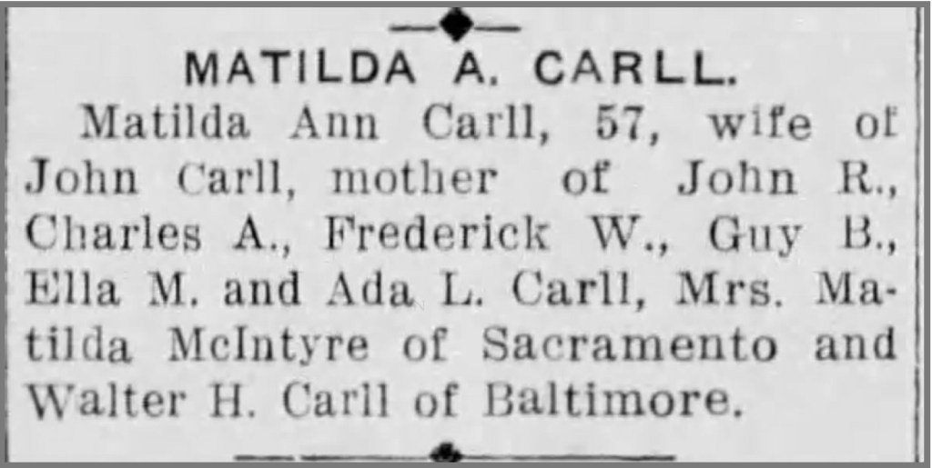 Matilda Ann Carll died in 1914. It appears that her son Frederick filed a petition for letters of administration, although the newspaper account in the Sacramento Star misidentified him as Matilda‘s husband. It also incorrectly gave her six sons and two daughters, while her obituary and other records show her with five sons and three daughters.