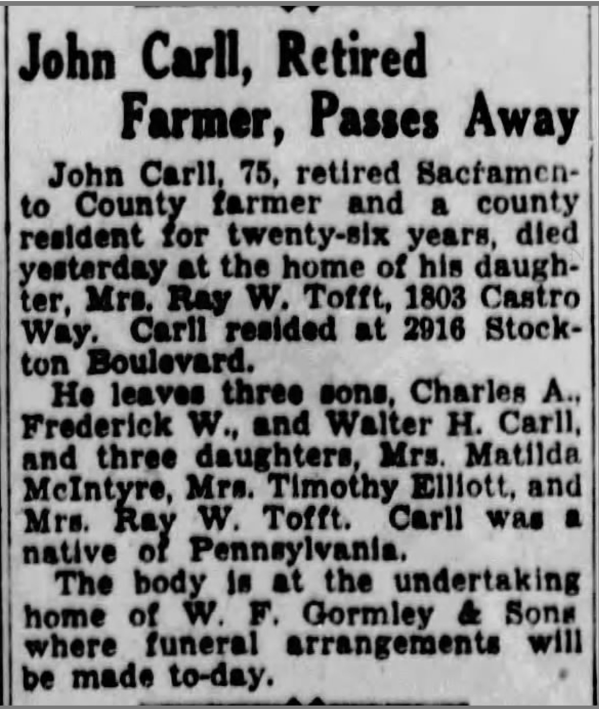 • “John Carll, Retired Farmer, Passes Away,” The Sacramento Bee (Sacramento, California), 19 Aug 1931, Page 11.