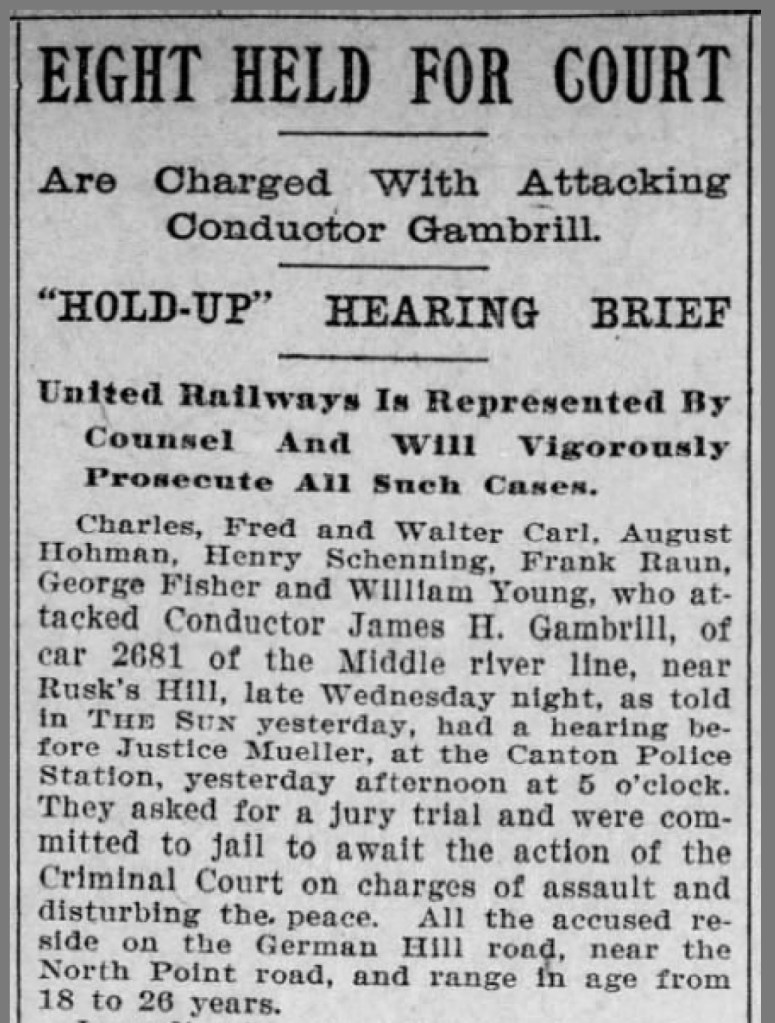 In June 1904, Charles, Fred, and Walter Carl were charged with attacking a United Railways conductor after a night of drinking with their friends.