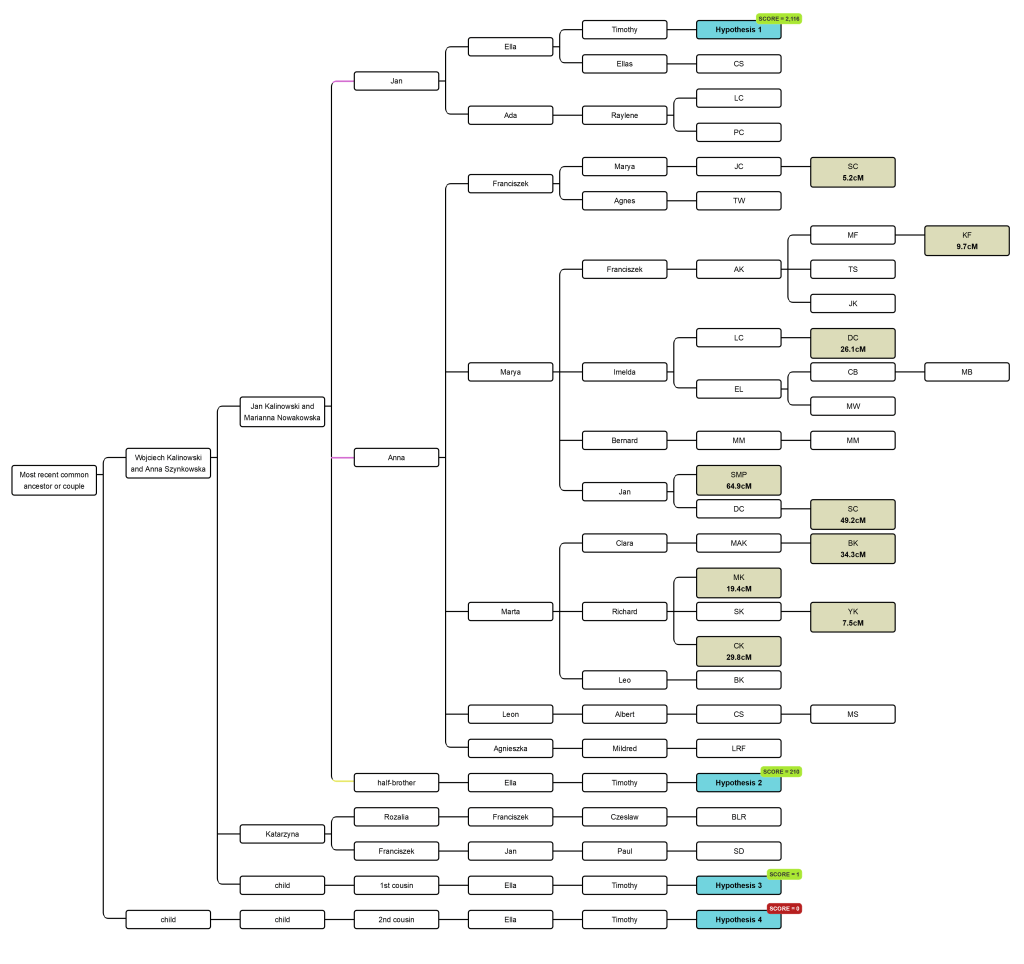 Hypotheses that John was a second or more distant cousin of Anna Kalinowski, are not statistically possible, given the amounts of DNA already identified. Adding more shared DNA amounts and looking at the DNA chromosome segments we share would add more certainty to the hypotheses estimates.