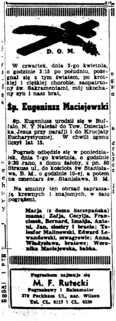 The late Eugeniusz was born in Buffalo, N.Y. He belonged to the Society of the Holy Child Jesus of the parish and to the Eucharistic Crusade. He was 15 years old at the time of his death.