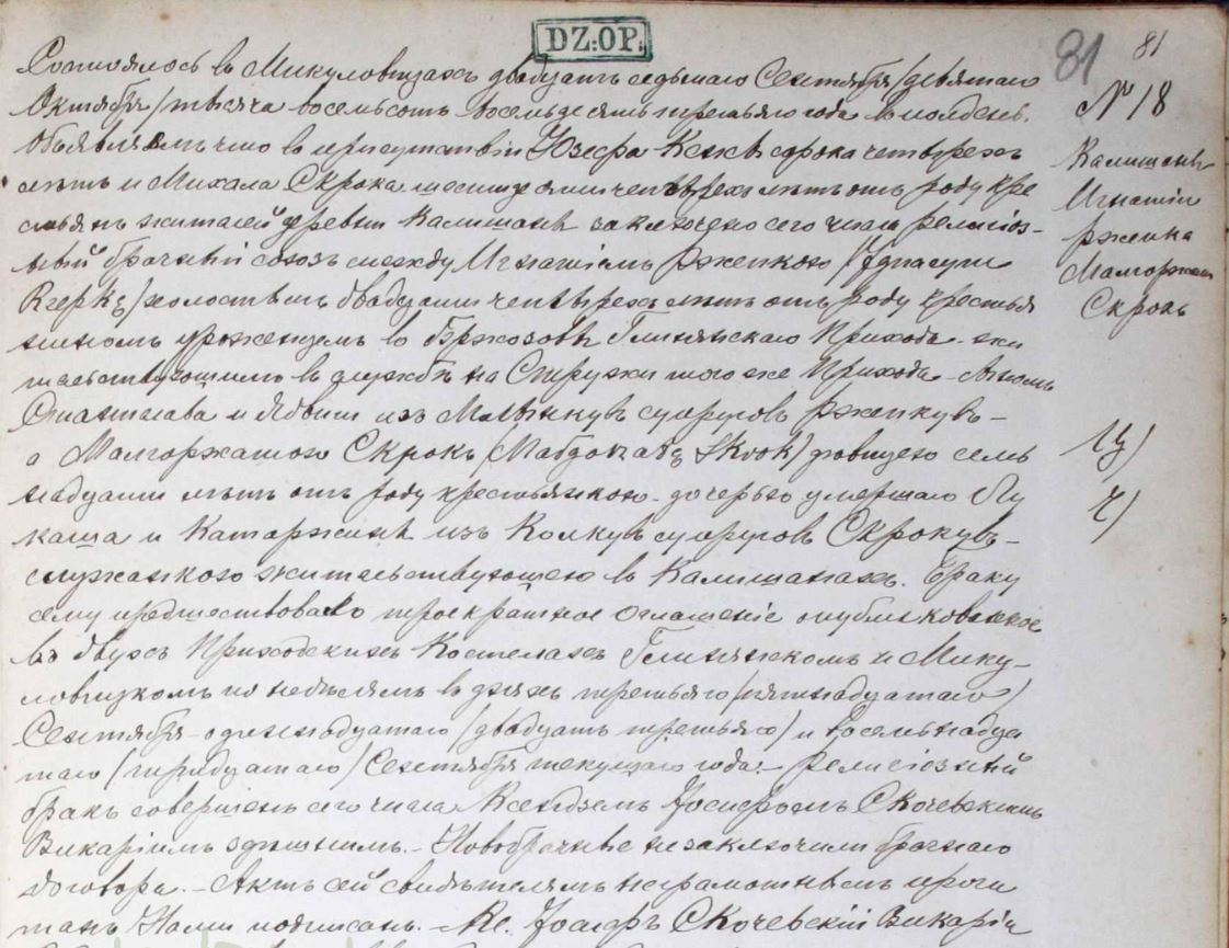 Took place in the village Mikułowice on September 27th/October 9th, 1883 at midday. We announce that today, in the presence of witnesses Józef Kołek, 44 years old, and Michał Skrok, 64 years old, both living in the village of Kaliszany, a religious marriage union was concluded between Ignacy Rzepka, bachelor, peasant, 24 years old, son of Stanisław and Jadwiga, nee Młynek, married couple Rzepka, born in the village Brzozowa of Gliniany parish and living in the village Stróża, also of Gliniany parish, and Małgorzata Skrok, maiden, servant, 17 years old, living in the village Kaliszany, daughter of Łukasz, already deceased, and Katarzyna, nee Kołek, married couple Skrok. This marriage was preceded by three marriage banns in the parishes of Mikulowice and Gliniany churches on September 15th, 23rd, 30th of the current year. The newlyweds stated that they did not conclude a prenuptial agreement. The religious wedding ceremony performed by priest Jósef Skoczewski. This act was read aloud to the illiterate present and then signed only by Us.