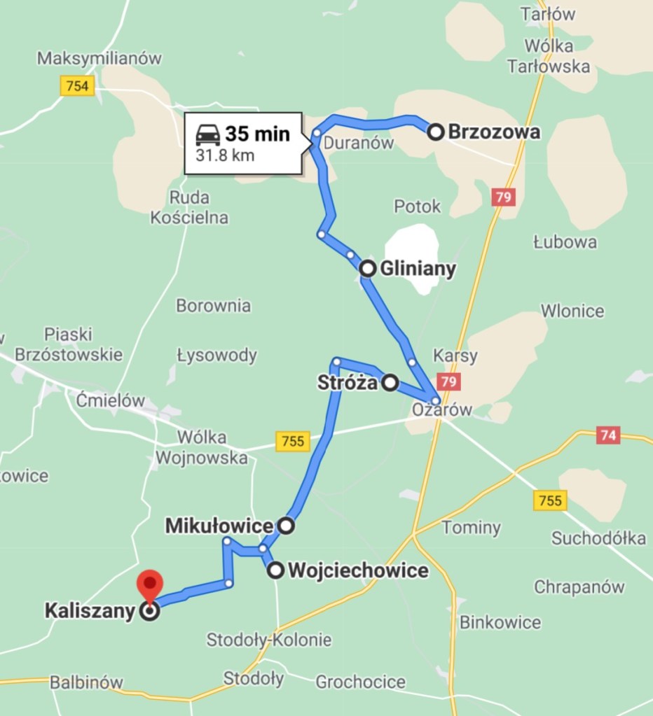 Brzozowa to Kaliszany, currently Opatów, Świętokrzyskie (Google map)