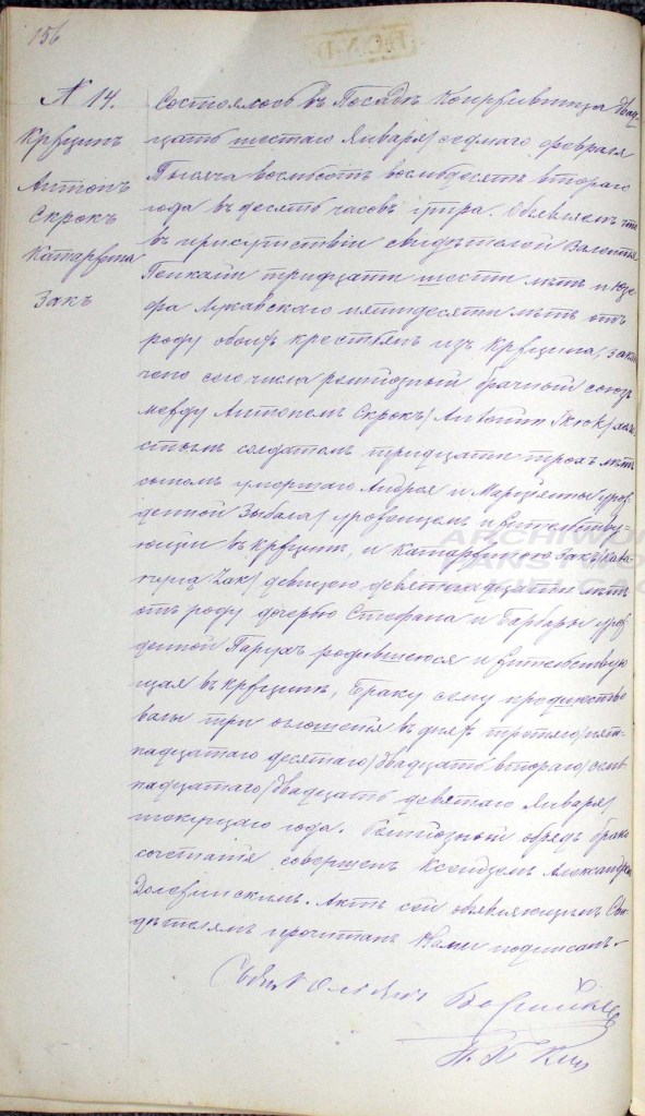 Took place in the village Koprzywnica on January 26th/February 7th,1882 at 10 o’clock in the morning. We announce that today, in the presence of witnesses Walenty Penkalt?,36 years old, and Józef Lukowski,50 years old, both peasants, residing in the village Krzcin, a religious marriage union was concluded between Antoni Skrok,bachelor,retired soldier,33 years old, born and residing in the village Krzcin, son of Andrzej, already deceased, and Maryanna, nee Zybała, the spouses Skrok, and Katarzyna Zak,a maiden,19 years old,born and residing in the village Krzcin, daughter of Stefan and Barbara, nee Paruch, the spouses Zak( in Russian written- Зак).This marriage was preceded by three marriage banns in the parish of Koprzywnica church on January 15th,22nd,29th of the current year. The religious wedding ceremony performed by priest Aleksander Dolzycki. This act was read aloud to the illiterate present and then signed only by Us.