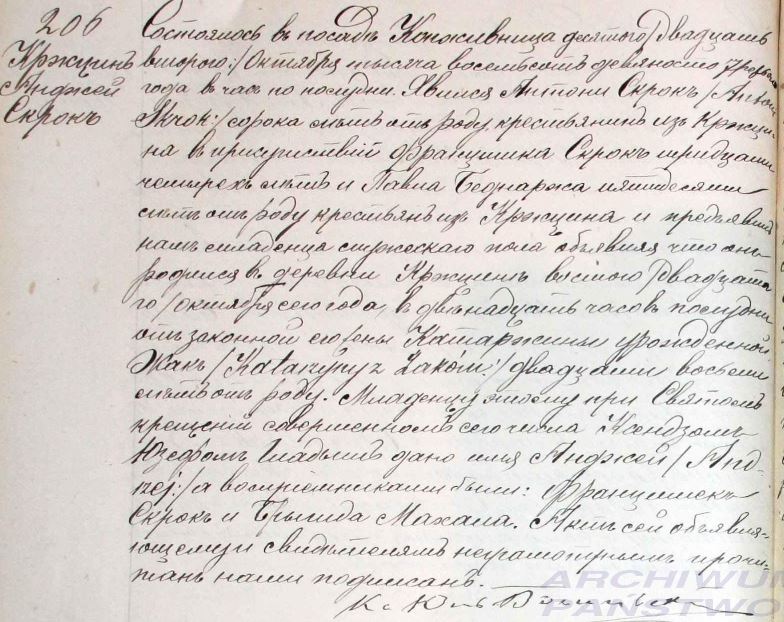 It is in Cyrillic, in the Napoleonic format, but you can read his father’s name, Antoni Skrok. His mother is Katarzyna Żak. (The preposition z and the suffix -ow indicate the original family name.) The baby’s name Andrzej is also in Roman letters.
