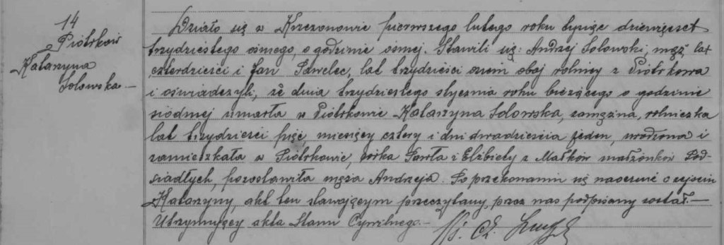 It happened in Krzczonów on February 01, 1938 at 8 am. Appeared Andrzej Solowski, husband, age 40, and Jan Pawelec, age 38, both farmers from Piotrków and the declared that that on January 30, current year at 7 a.m. died in Piotrków, Katarzyna Solowska, married, farmer, 35 years, 4 month and 21 days old. She was born and living in Piotrków, daughter of Paweł and Elżbieta nee Małek, married couple Podsiadły. She left behind her husband Andrzej. After seeing her death firsthand this act was read to the present and signed by the priest/ civil registrar.