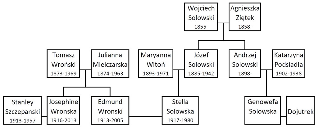 Józef and Andrzej Solowski were brothers, and Genowefa was the daughter of Andrzej Solowski, so Józef Solowski was her uncle and Maryanna Witoń Solowska was Genowefa Solowska Dojutrek‘s aunt by marriage. The letters were retrieved from the papers of Josephine Wronska Szczepanska by her daughter and scanned and shared by the son of Edmund Wronski and Stella Solowska.