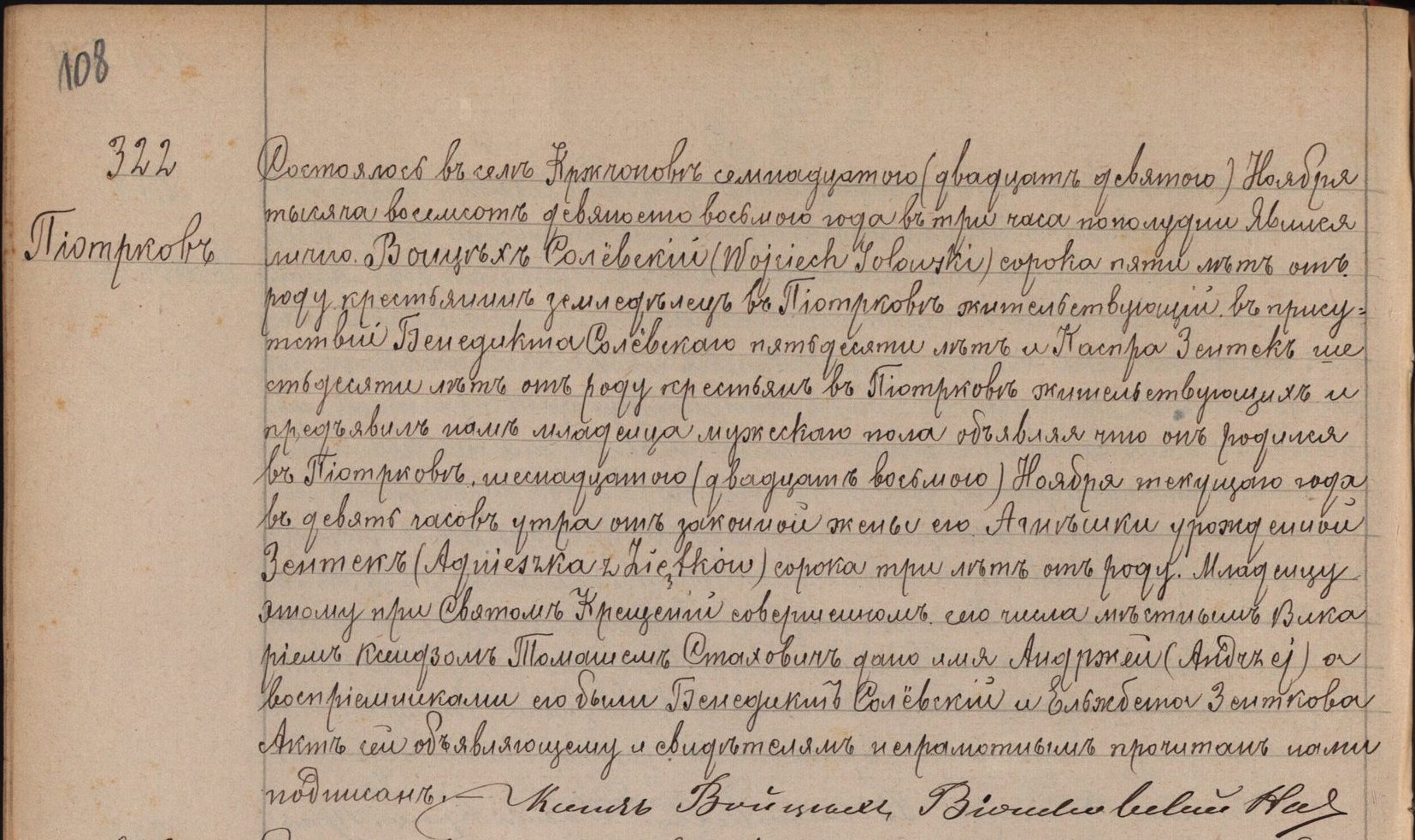 Took place in the village of Krzczonów on 17/29 November 1898 at 3 o’clock in the afternoon. Appeared in person Wojciech Solowski, peasant, 45 years old, residing in the village of Piotrków, and in the presence of the witnesses Benedykt Solowski, age 50,and Kacper Ziętek, age 60, both peasants, residing in Piotrków, he presented to Us a child of male sex stating that this child was born in the village of Piotrków on 16/28 November of the current year at 9 o’clock in the morning to his lawful wife Agnieszka, née Ziętek, 43 years old. At the Holy baptism performed on this day by priest, local vicar, Tomasz Stachowicz this child was given the name Andrzej and his godparents were Benedykt Solowski and Elżbieta Ziętek. This act was read aloud to the illiterate people present and signed only by Us.
