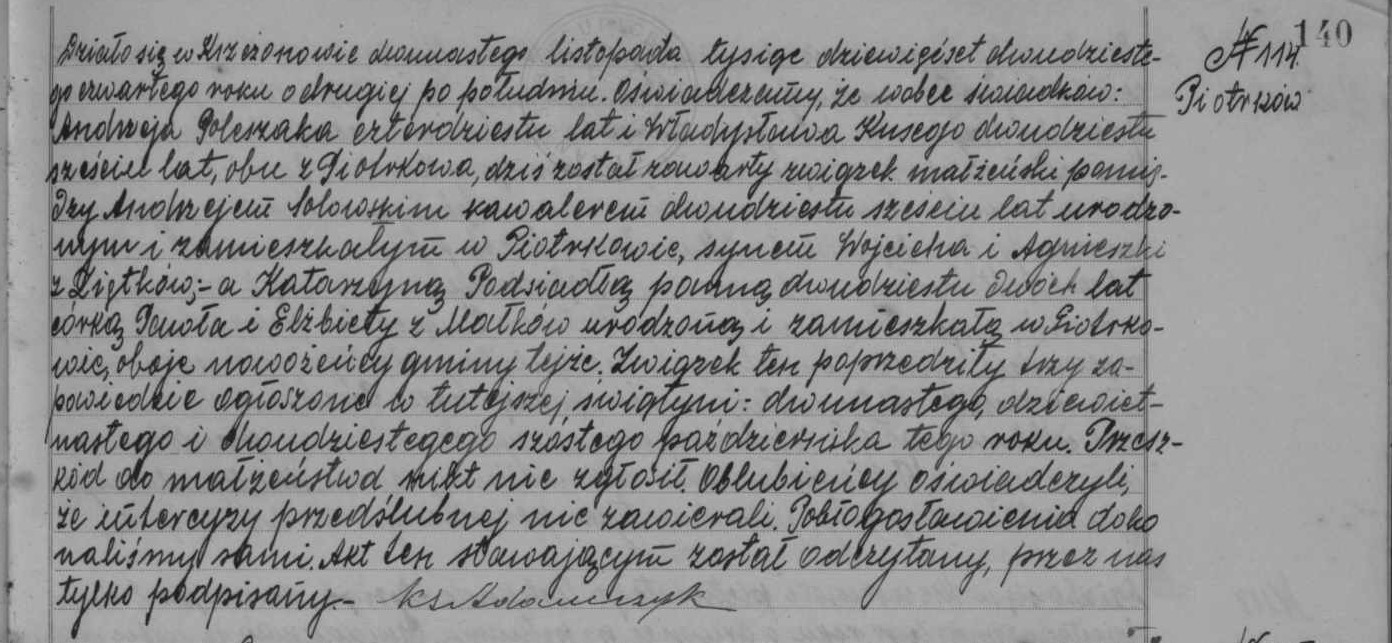 Groom – Andrzej Solowski, a bachelor , 26 years old , born and residing in Piotrków , the son of Wojciech and Agnieszka nee Ziętek .