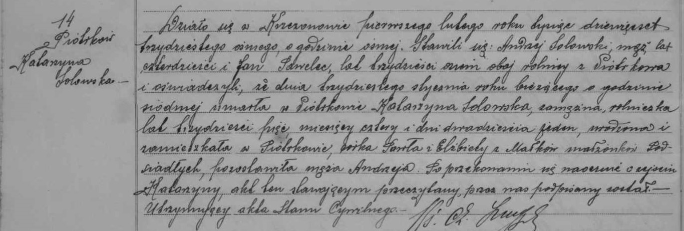It happened in Krzczonów on February 01, 1938 at 8 am. Appeared Andrzej Solowski, husband, age 40, and Jan Pawelec, age 38, both farmers from Piotrków and the declared that that on January 30, current year at 7 a.m. died in Piotrków, Katarzyna Solowska, married, farmer, 35 years, 4 month and 21 days old. She was born and living in Piotrków, daughter of Paweł and Elżbieta nee Małek, married couple Podsiadły. She left behind her husband Andrzej. After seeing her death firsthand this act was read to the present and signed by the priest/ civil registrar.