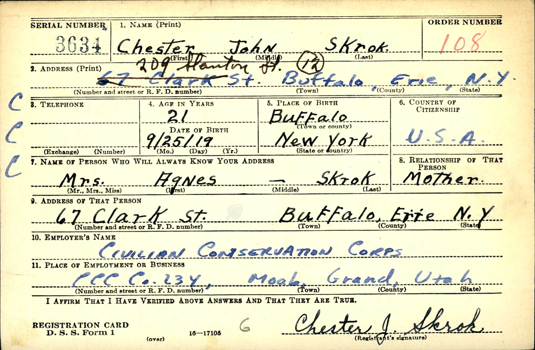 On 10 January 1940, Chester Skrok joined the Civilian Conservation Corps in Fort Dix, New Jersey. On his application he expressed the reason “to aid family financially.” As he served, his mother in Buffalo, New York received an allotment of $22 a month, equivalent to approximately $452 in 2022.