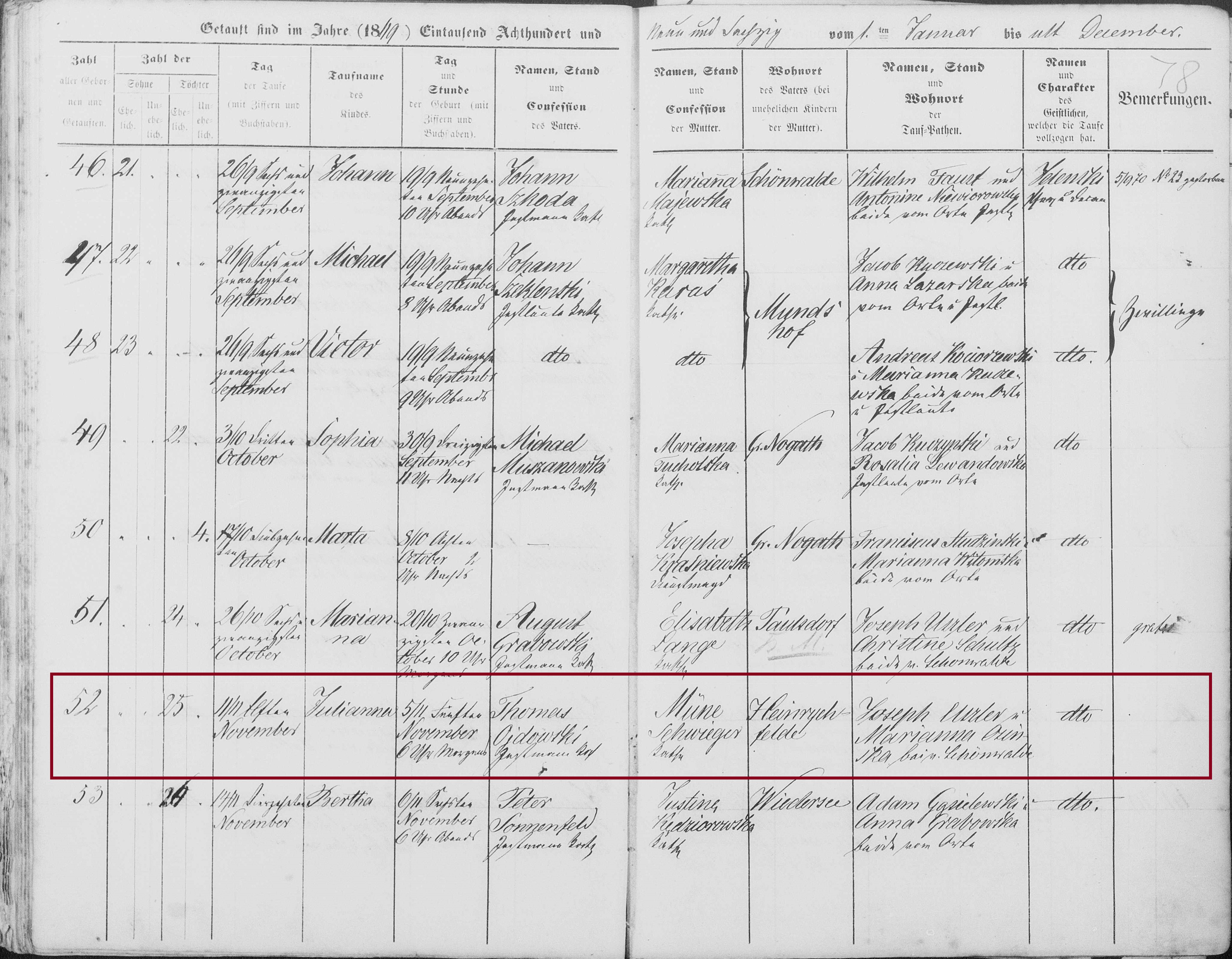Julianna Ojdowska was born 5 November 1869 in Heinrichsfelde and baptized 11 November 1869 in Kościół Narodzenie Najświętszej Maryi Panny [Church of the Nativity of the Blessed Virgin Mary] in Groß Schönwalde / Szynwałd, Grudziądz. Her parents were Thomas [Tomasz] Ojdowski and Müne Schweiger.