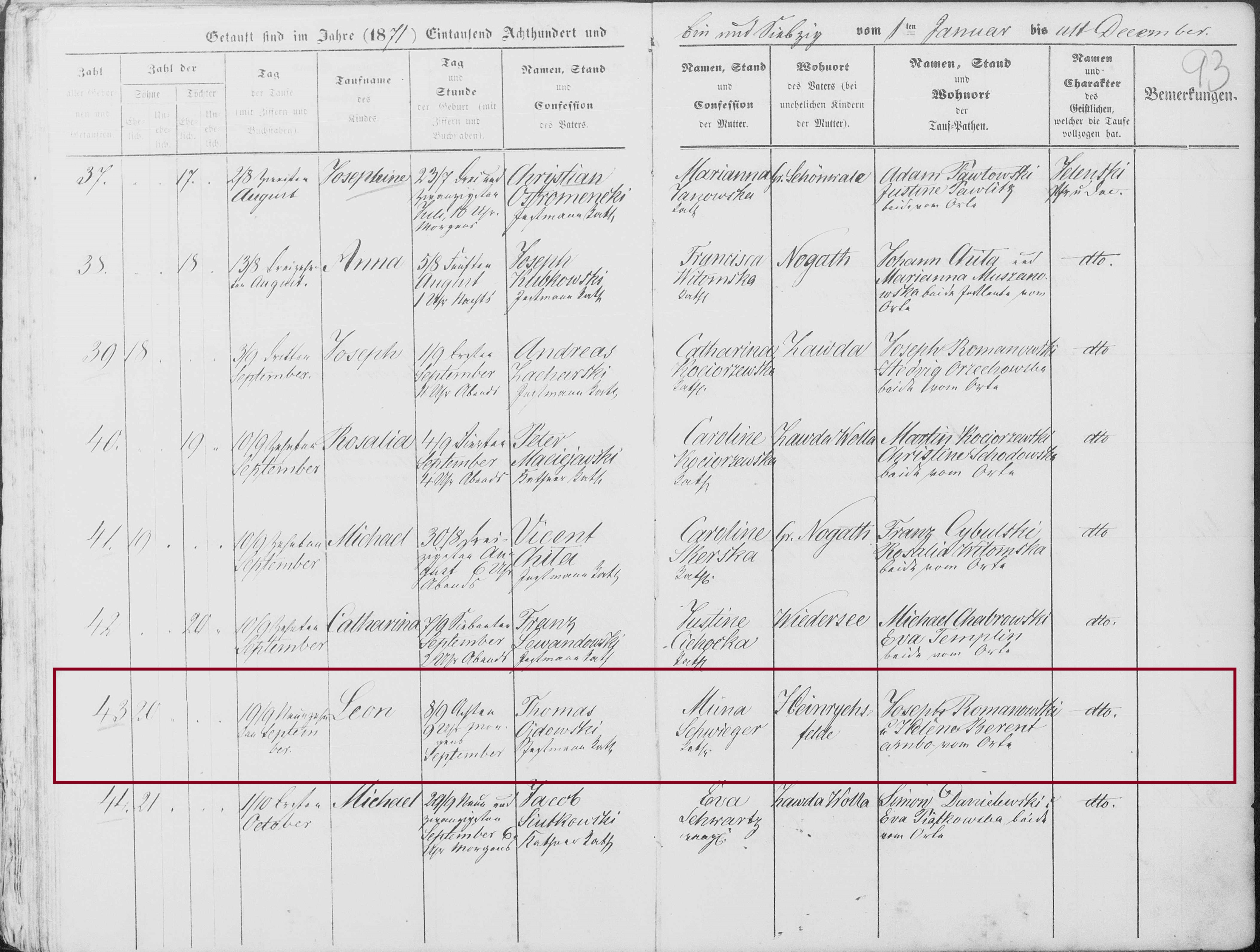 Julianna‘s brother Leon Ojdowski was also born in Heinrichsfelde and baptized in Kościół Narodzenie Najświętszej Maryi Panny [Church of the Nativity of the Blessed Virgin Mary] in Groß Schönwalde / Szynwałd, Grudziądz. His birth date was 8 Sep 1871 and he was baptized 19 Sep 1871.