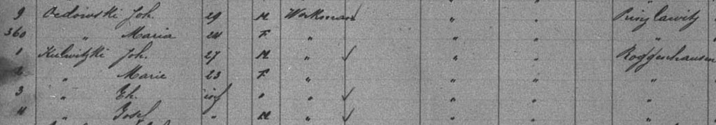 The same manifest page had Joh. and Maria Ocdowski, ages 29 and 24, and Joh. and Marie Kulwitzki, ages 27, 23, and two children, Th. and Josef.