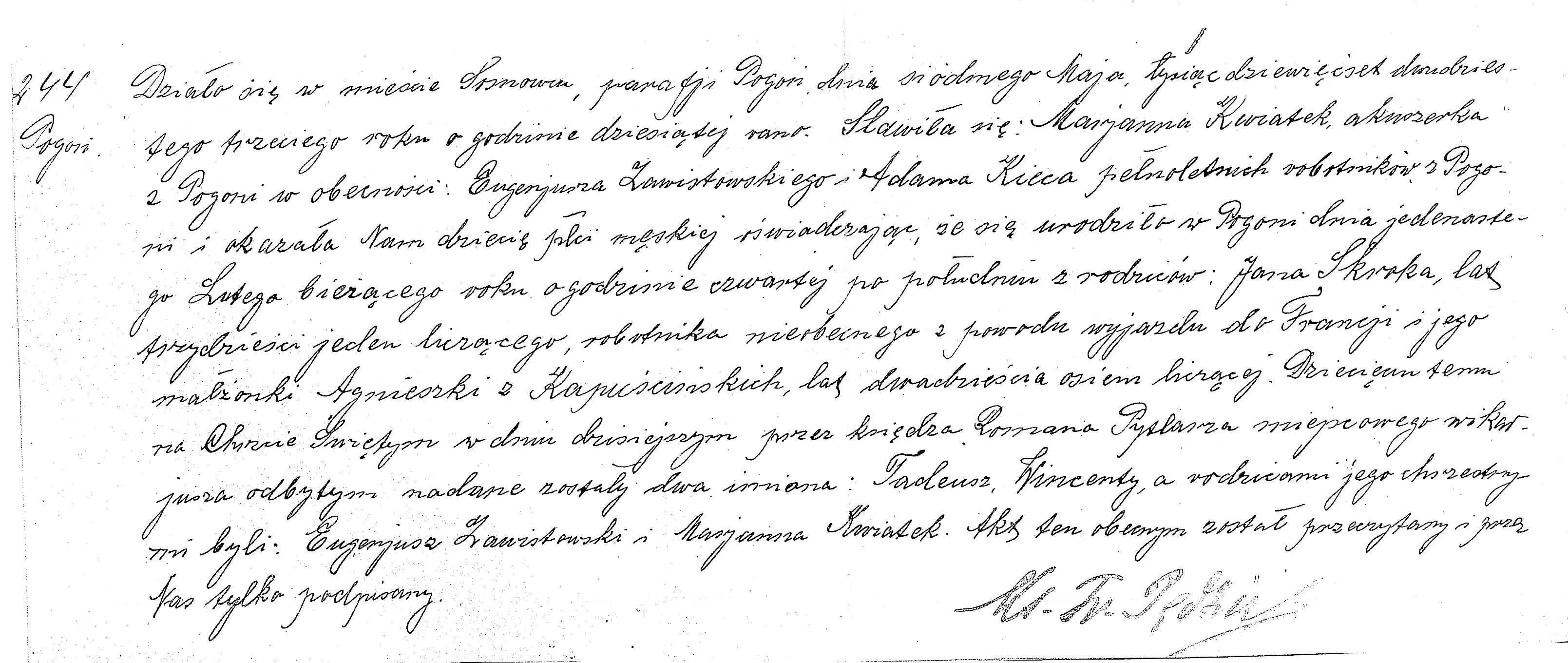 This child was given two names, Tadeusz Wicenty, during a holy baptism held today by the local vicar, Father Roman Pyslasz. The godparents were Eugeniusz Zawistowski and Marjanna Kwiatek. This record was read to the present persons and signed only by us.