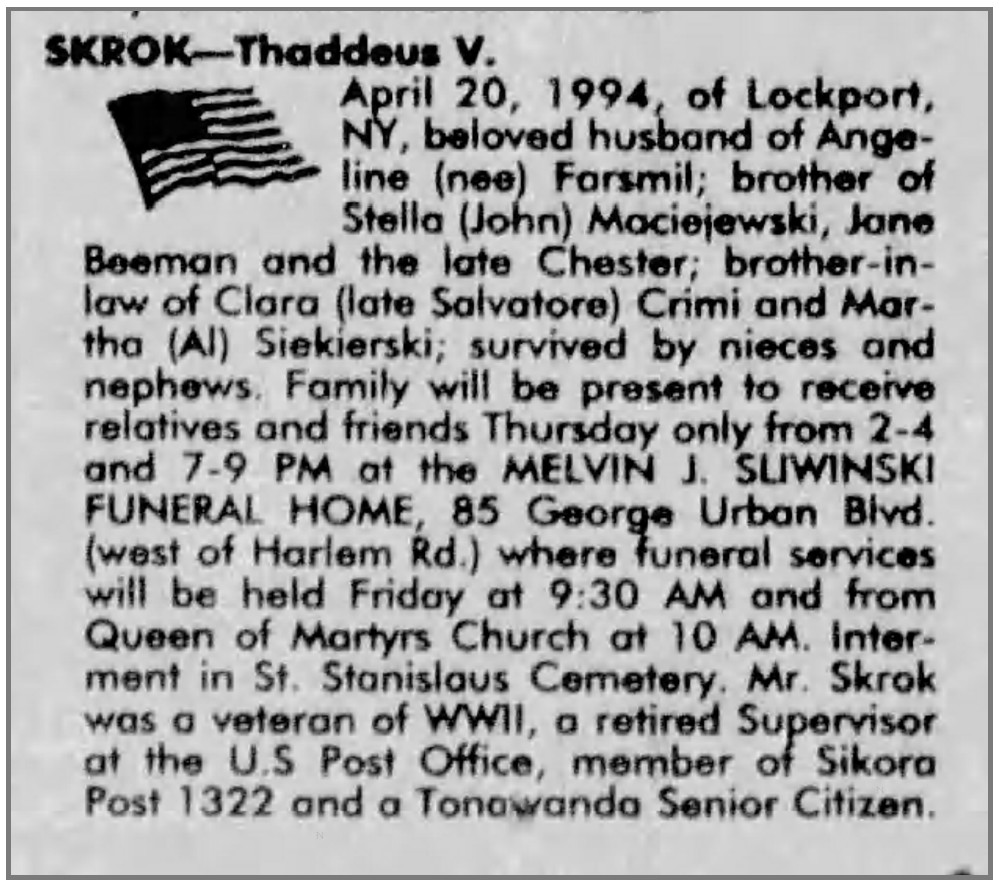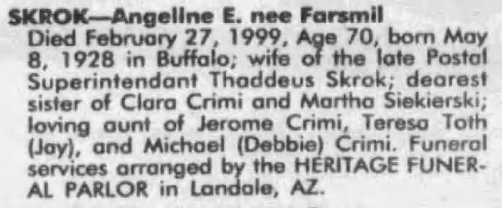 Ted‘s widow Angeline E. Farsmil Skrok died 27 Feb 1999 and was laid to rest in West Resthaven Park Cemetery in Glendale, Maricopa, Arizona.