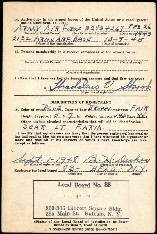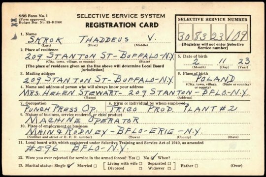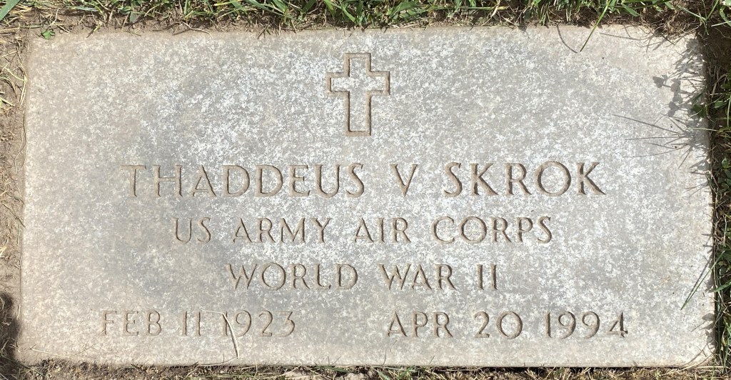 Thaddeus Vincent Skrok was his name in English, but he was called Ted or Teddy. He served in the Army Air Corps in the Pacific in World War II, and registered for the Korean draft in 1948.