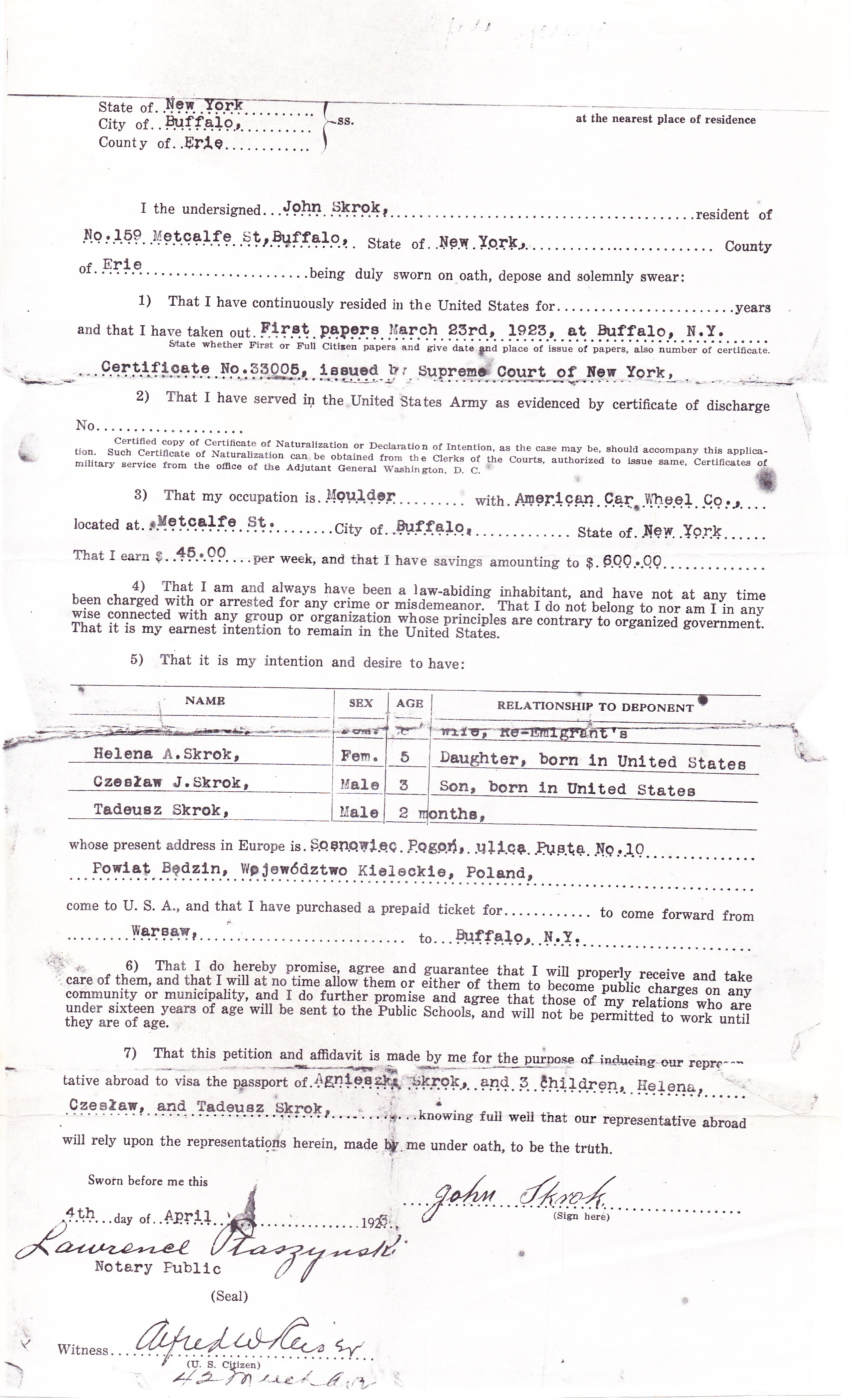 Once in Buffalo, Jan Skrok declared his intention to become a citizen, and applied for his wife and children to join him in America.