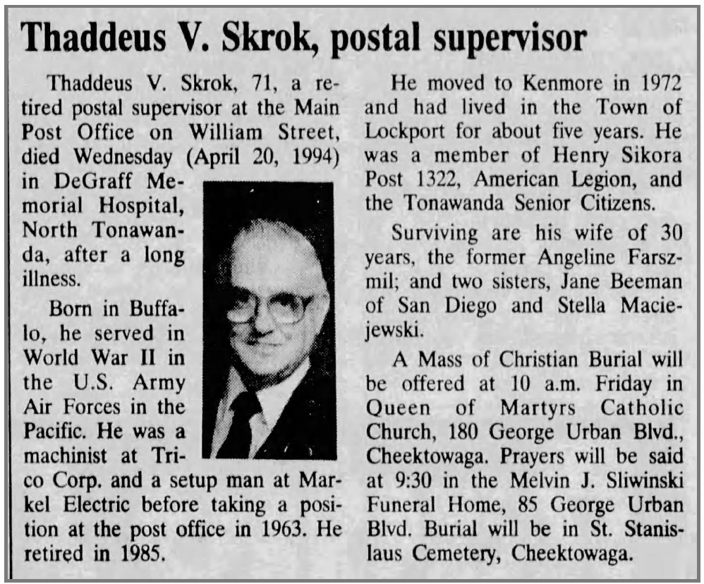 Thaddeus V. Skrok worked for the United States Post Office and was Postmaster for several locations before retiring from the Main Post Office on William Street in Buffalo in 1985.