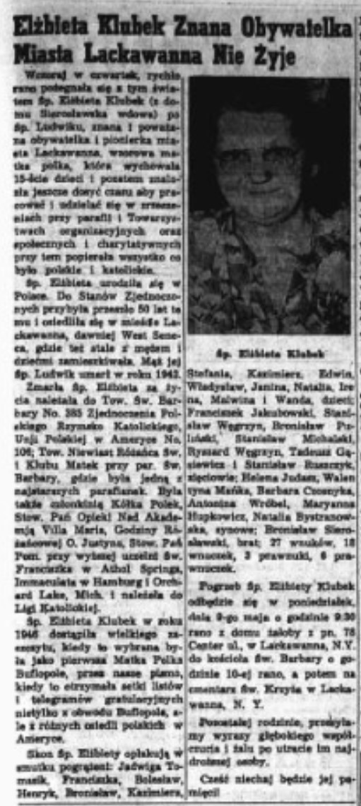 Ludwik Klubek died in 1942. He was survived by his wife, Elżbieta Sierosławska Klubek, who died in 1955. They left behind a large family. Her obituary “Elżbieta Klubek Znana Obywatelka Miasta Lackawanna Nie Żyje” [Elżbieta Klubek A well-known citizen of the city of Lackawanna has died], with a picture, was on page 13 of the Dziennik dla Wszystkich on May 6, 1955.