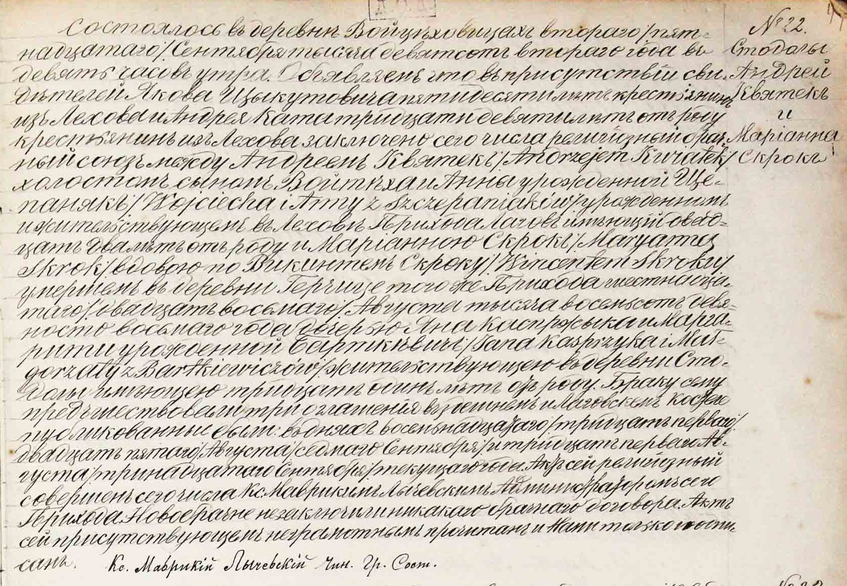 This happened in Wojciechowice (Mikułowice) on the seventh / nineteenth of January in the year one thousand eight hundred eighty seven at ten o’clock after midnight. We announce that, in the presence of witnesses Józef Kęsa, forty four years old, and Jan Woźniak, sixty years old, peasants, residents of the village of Kaliszany, on this day a religious marriage was contracted between Wincenty Skrok, a bachelor, son of the late Łukasz and of Katarzyna nèe Kołek married couple Skrok, he is a peasant and is twenty six years old, resides in the village of Kaliszany; and between Maryanna Kasprzyk, a maiden, seventeen years old, a daughter of the late Jan and of Małgorzata nèe Bartkiewicz married couple Kasprzak, peasants, residents of the village of Kaliszany. This marriage was preceded by three readings of the banns issued in this parish church on Sundays, to wit on the twenty first of December / second of January, the twenty eighth of December / ninth of January, and the fourth / sixteenth of January of the current year. This marriage ceremony was performed today by Fr. Karol Tarczawski, a vicar. The newlyweds announced that they have made no prenuptial agreement. This record was read to the declarants who are all illiterate, and then it was signed by us. [signature illegible]