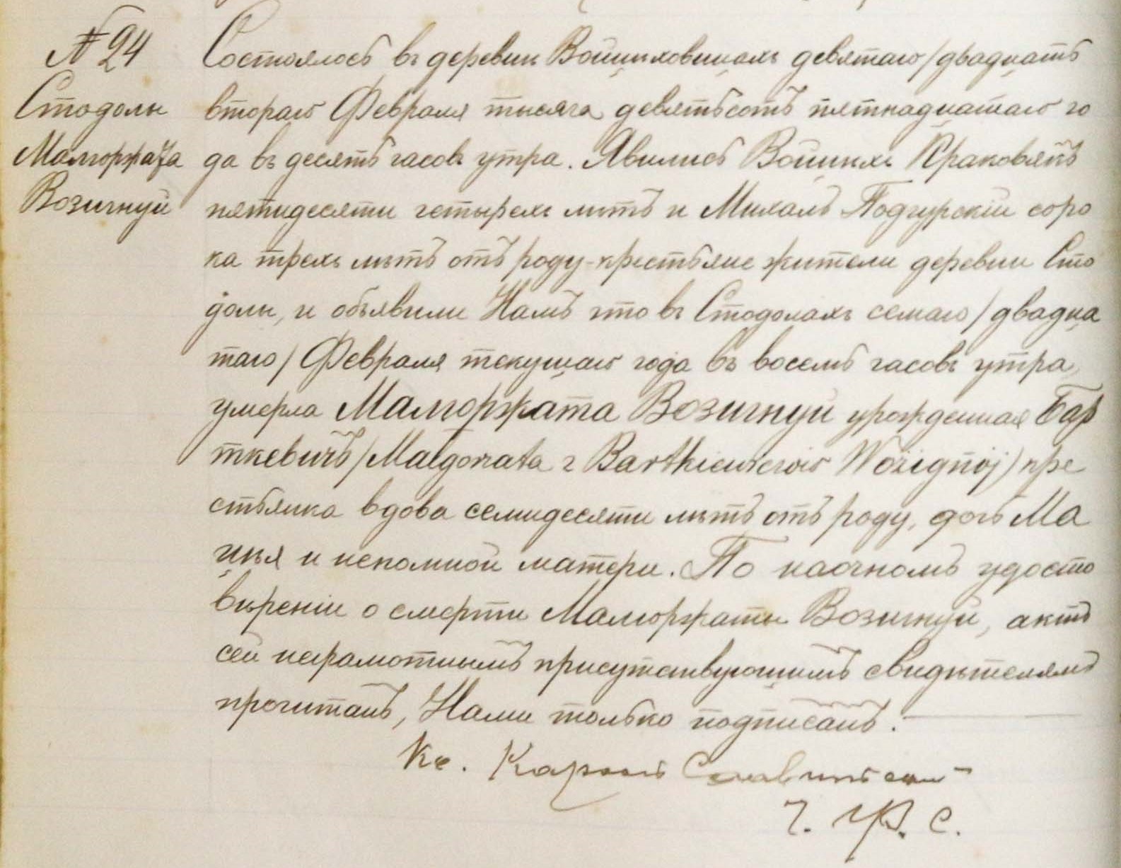 Wojciech Krakowiak, age 54, and Michal Podgurski, age 43, peasant farmers from the village of Stodoły, appeared and declared the death of Małgorzata Wozignój, which took place on 7/20 February at 8 am. She was a peasant & widow and was 70 years old. It mentions her father was Maciej Bartkiewicz and says that her mother’s name has been forgotten.
