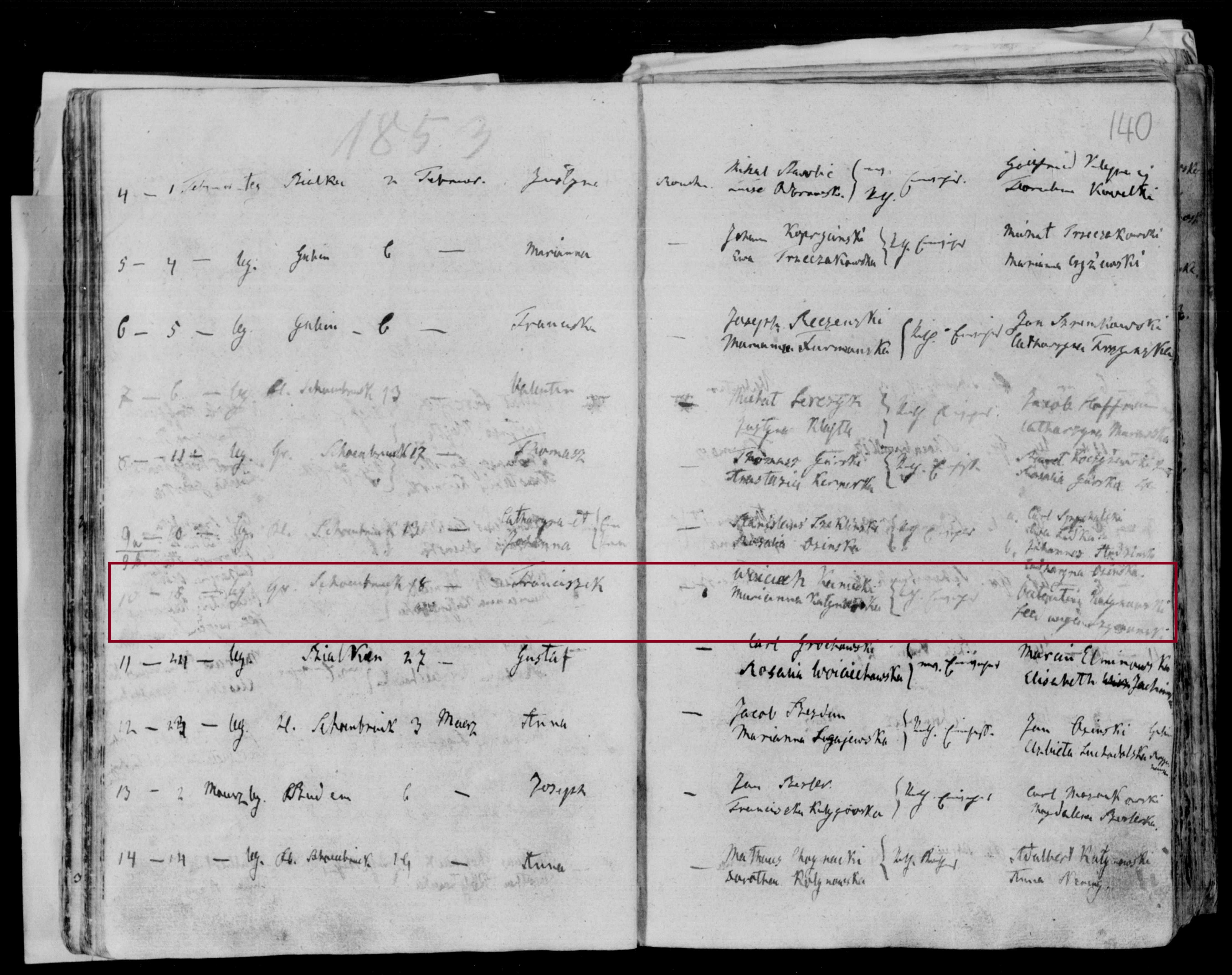 Wojciech Kaniecki and Marianna Kalinowska were married on 11 November 1849 in Szembruk, Grudziądz, Kościół św. Bartłomieja, in Groß Schönbrück, Graudenz, Marienwerder, Westpreußen, Preußen. Wojciech was 25 years old, so he would have been born about 1824. Marianna was 24 years old, so she would have been born about 1825. Witnesses were Wojciech Kałynowski and Andreas (Andrzej in Polish) Kaniecki.