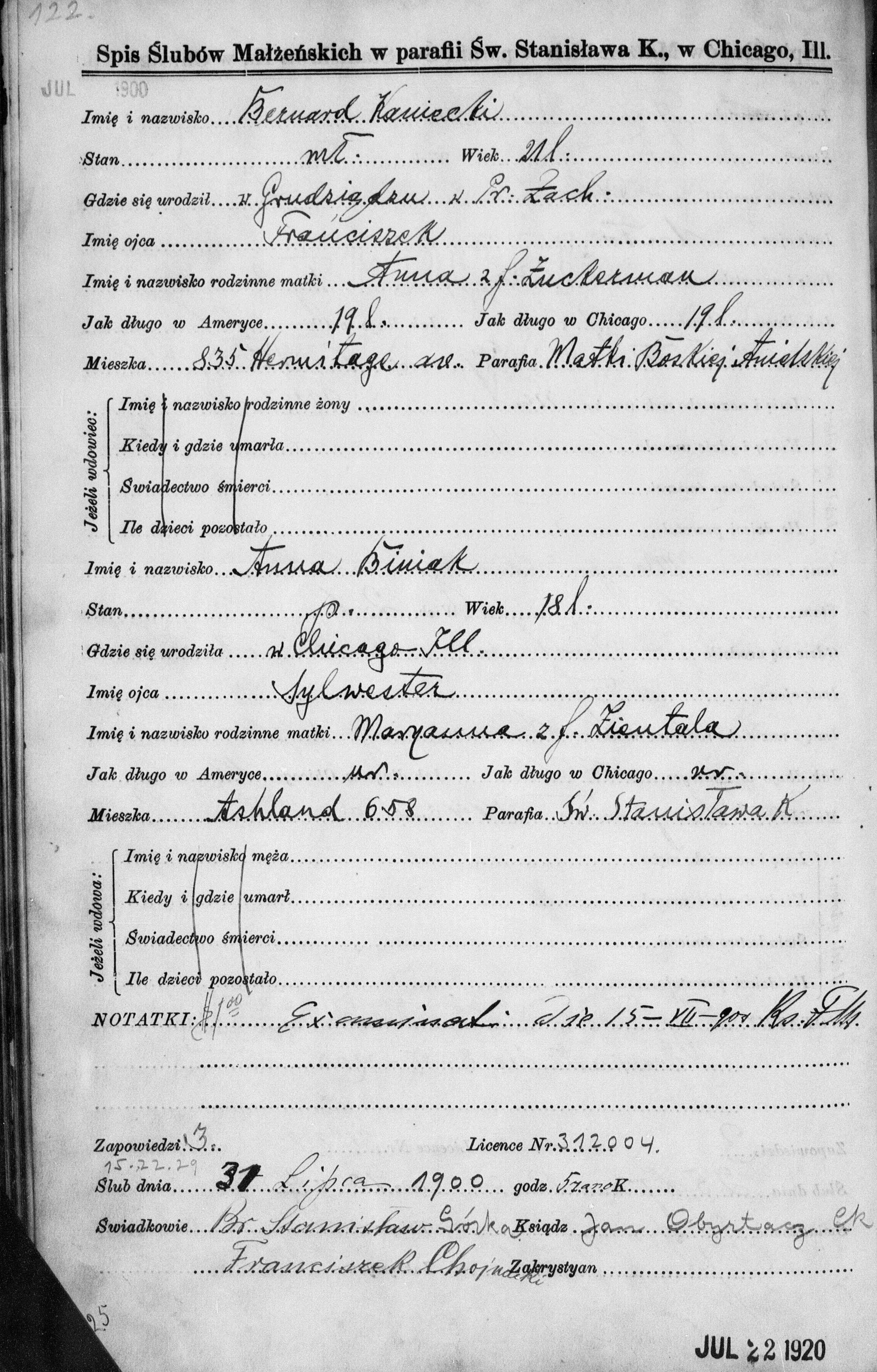 Bernard Kaniecki and Anna Biniak were married in Chicago, Illinois, at St. Stanislaus Kostka Church on 31 Jul 1900.