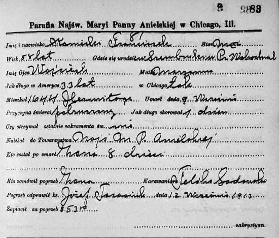 Franciszek Kaniecki died 9 Sep 1913. His funeral was at Najsw. Maryi Panny Anielskiej, St. Mary of the Angels Parish on Hermitage Avenue in Chicago.