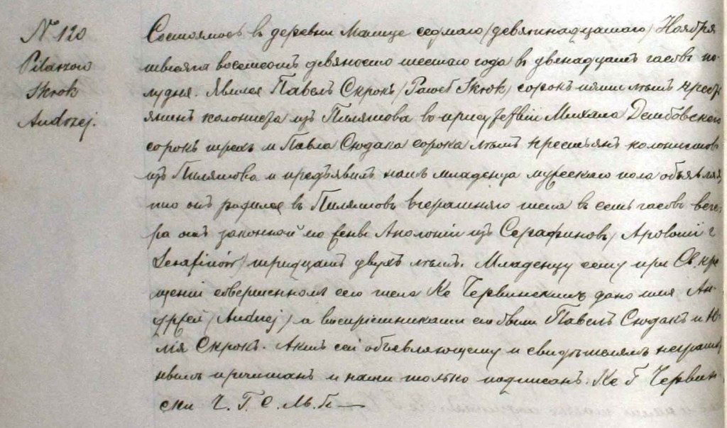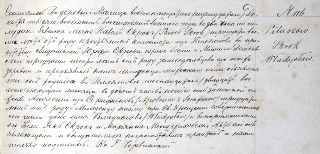 Władysław Skrok born 16/28 December. Father Paweł Skrok 38 age m. Apolonia nee Serafin 30 age, witness Józef Skrok 48 age, Michał Dębowski 36 age. Godparents Jan Skrok and Marianna Mędrzychowska.