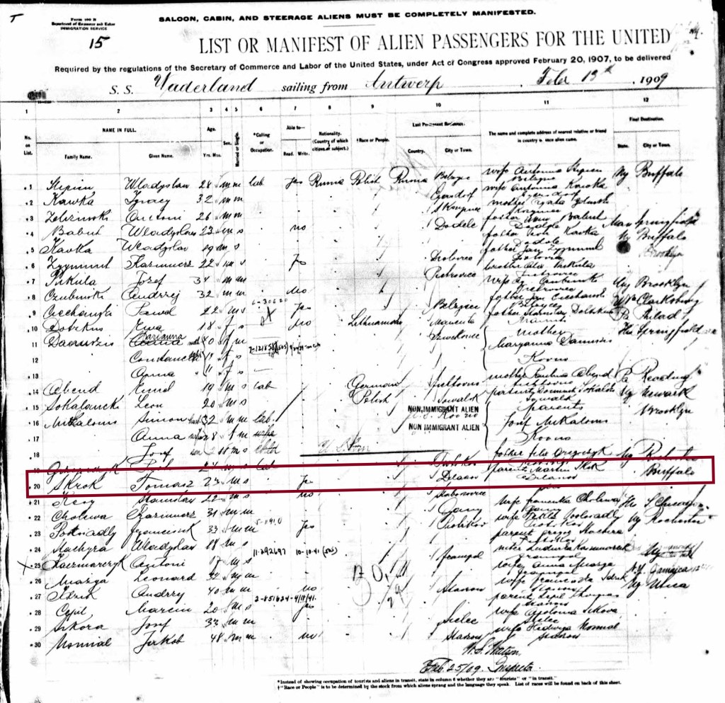 Tomasz Skrok immigrated on 25 Feb 1909 to New York, New York, United States on the ship Vaderland from Antwerp, Belgium with a final destination of Buffalo, New York.