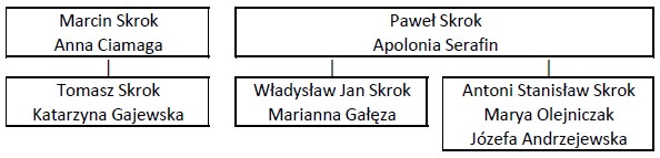 While Tomasz Skrok was the son of Marcin Skrok and Anna Ciamaga, Władysław and Antoni Skrok were brothers, the sons of Paweł Skrok and Apolonia Serafin.