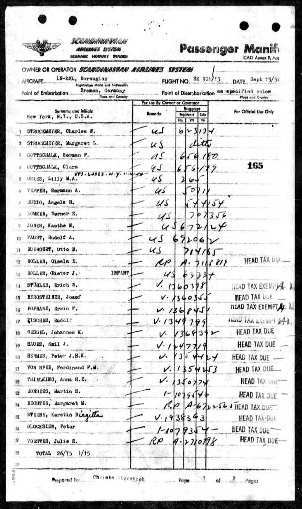 1952 air passenger manifest, Scandinavian Airlines, Bremen to New York