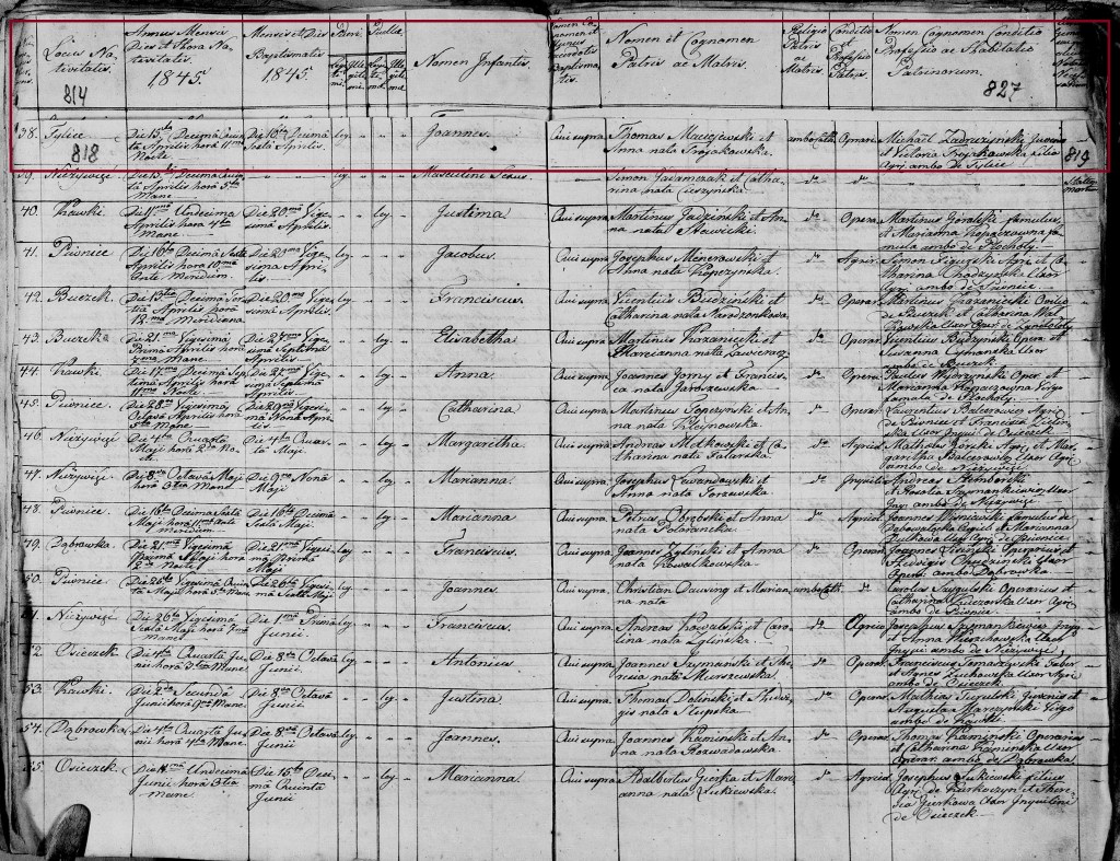 1845 birth, Joannes, son of Thomas Maciejewski and Anna Trojanowska, Tylice, Nieżywięć