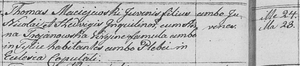 Thomas Maciejewski was 24 years old, the unmarried son of Nicolai (in Polish Mikolaj) and Hedvigia (in Polish Jadwiga). Anna Trojanowska was a 23 year old unmarried woman.