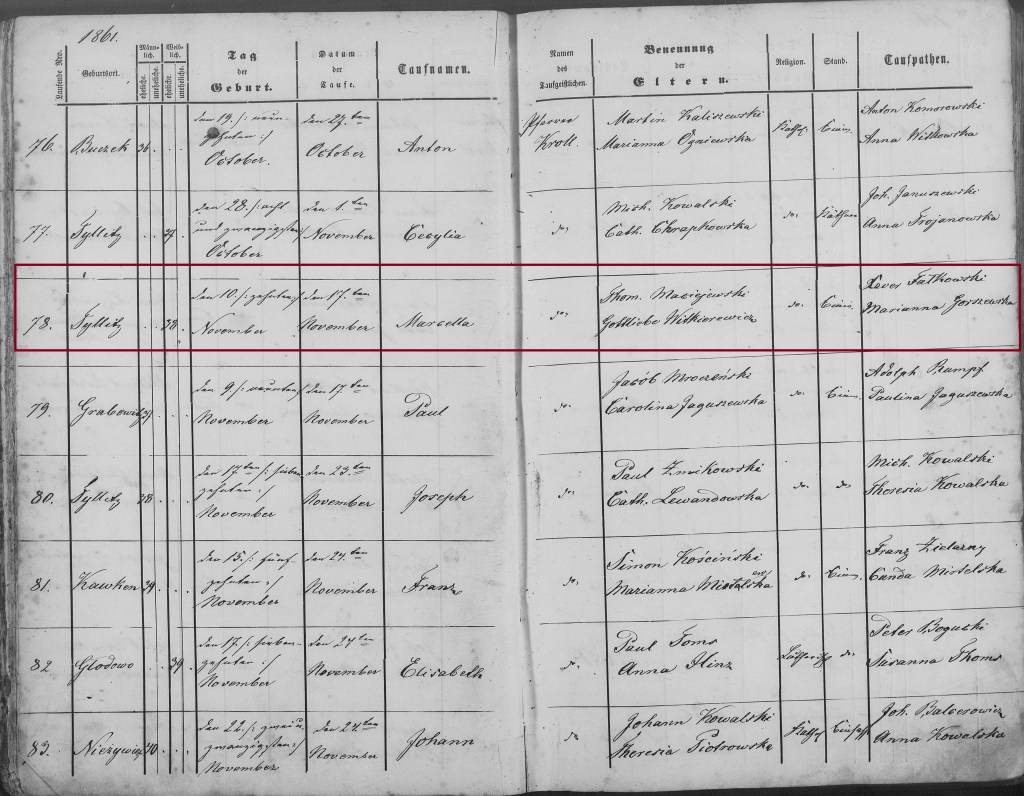 KG‘s great-grandmother Salomea Maciejewska was born 28 March 1870 in Tillitz (German for Tylice). Her father was Thomas Maciejewski. Her mother was Gottliebe (Bogumiła in Polish) Barbarska.