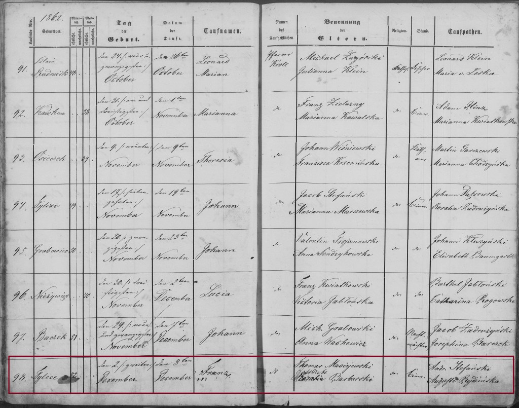 1862 birth, Franz, son of Thomas Maciejewski and Gottliebe Barbarski, Tylice, Nieżywięć