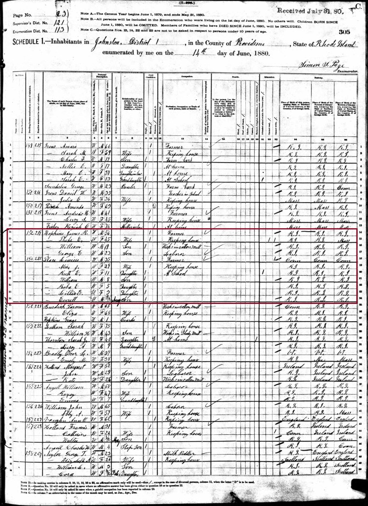 • 1880 Federal Census, Rhode Island, population schedule, Johnston, Providence, Rhode Island, USA, enumeration district (ED) Enumeration District: 113, Page: 305C, Lucius Place; digital images, (online : accessed 24 August 2019); Tenth Census of the United States, 1880.