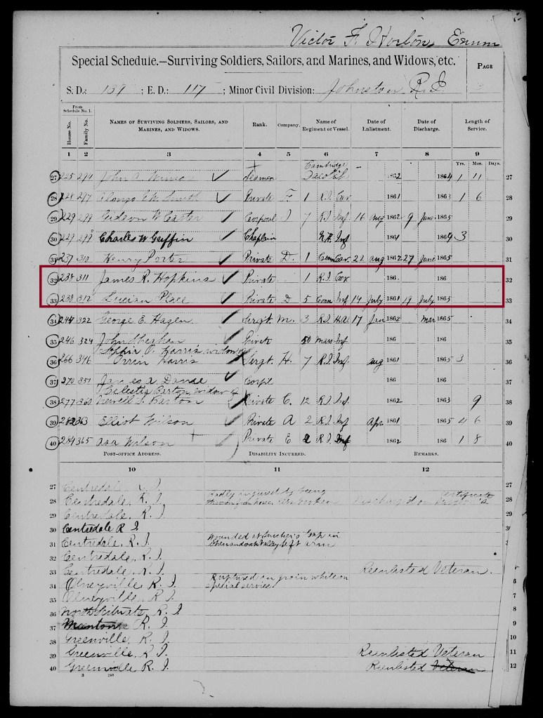 Both James R. Hopkins and Lucian Place were listed in the 1890 Special Schedule of the Census Enumerating Union Veterans and Widows of Union Veterans of the Civil War in Johnston, Rhode Island.