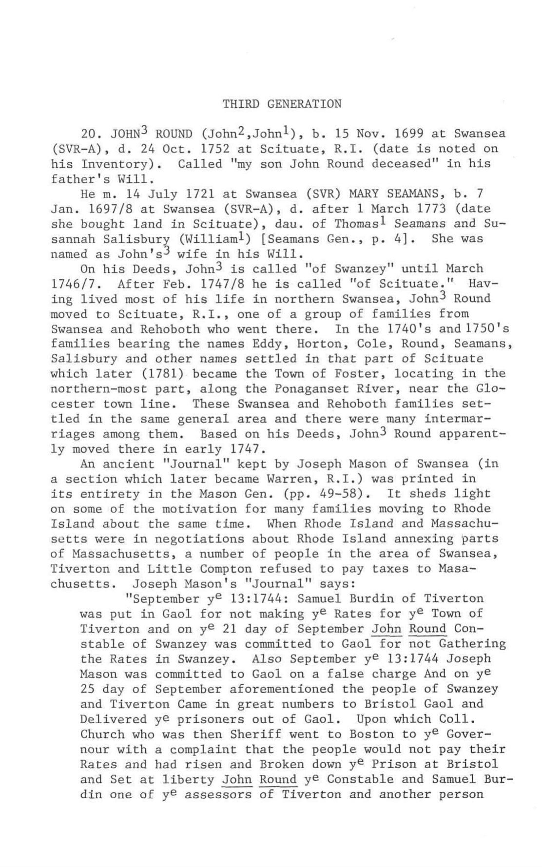 In the “Third Generation,” the author quotes Alverdo Hayward Mason, Genealogy of the Sampson Mason Family (E. Braintree, MA: Printed by A. H. Mason, 1902), how ancestral families Round, Seamans, Salisbury, and others came to move from Swansea, Massachusetts to Scituate, Rhode Island, about 1744. Briefly, they objected to paying civil taxes for church ministers, and were thrown in jail. The townspeople rioted, broke down the jail, the governor sent troops, and several families decided to move to Scituate, Rhode Island.