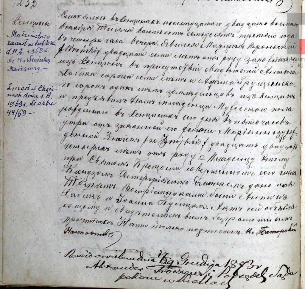 In 1873, this area was under Russian rule, so the records were required to be written in Russian or the Cyrillic alphabet. While I can pick out some letters and words, I do not read Cyrillic, so another researcher confirmed Tomasz Wroński‘s name, his date of birth, 28 Dec 1873, and his parents’ names and ages–Marcin 27, Marjanna Znojek 24.