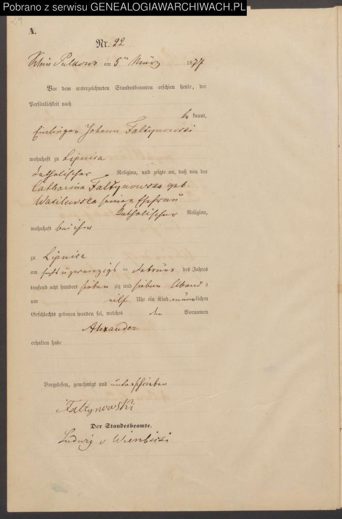 Aleksander Faltynowski was born 26 Feb 1877 in Lipnica, recorded 5 Mar 1877 in Klein Pulkowo (Pulkowo Male)