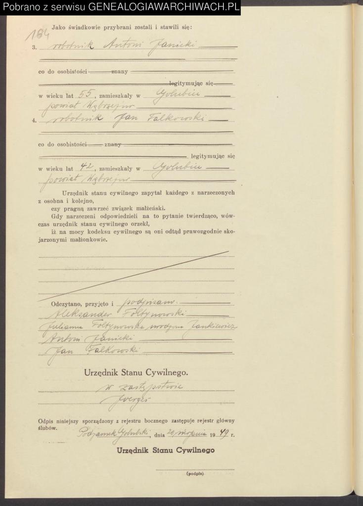 The same administrator of the Polish Genealogy Facebook Group found a copy of the marriage record for Aleksander Faltynowski and Julianna Jankiewicz in Golub 11 Nov 1901 ( akt nr 14, skan 14 ).